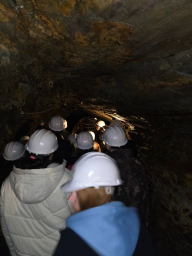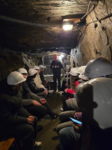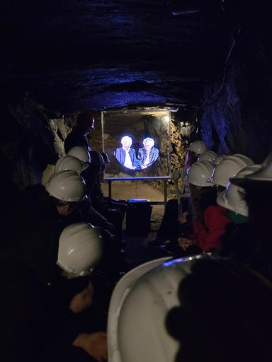 Im Anschluss betrat die Klasse den historischen Stollenbunker. Zwischen den engen Gängen und kühlen Wänden sahen die Schülerinnen und Schüler Videos von Zeitzeuginnen und Zeitzeugen. Die persönlichen Berichte über Angst, Hoffnung und Zusammenhalt machten besonders deutlich, welche Bedeutung dieser Ort für viele Menschen hatte. Durch die Mischung aus filmischen Eindrücken und der authentischen Umgebung entstand ein sehr lebendiger Einblick in die Vergangenheit.